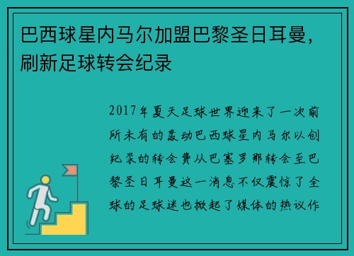 巴西球星内马尔加盟巴黎圣日耳曼,刷新足球转会纪录