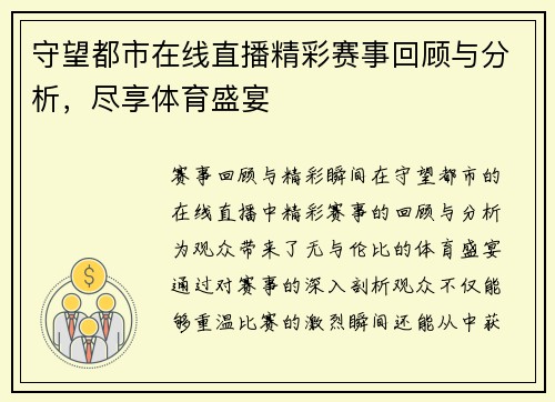 守望都市在线直播精彩赛事回顾与分析,尽享体育盛宴